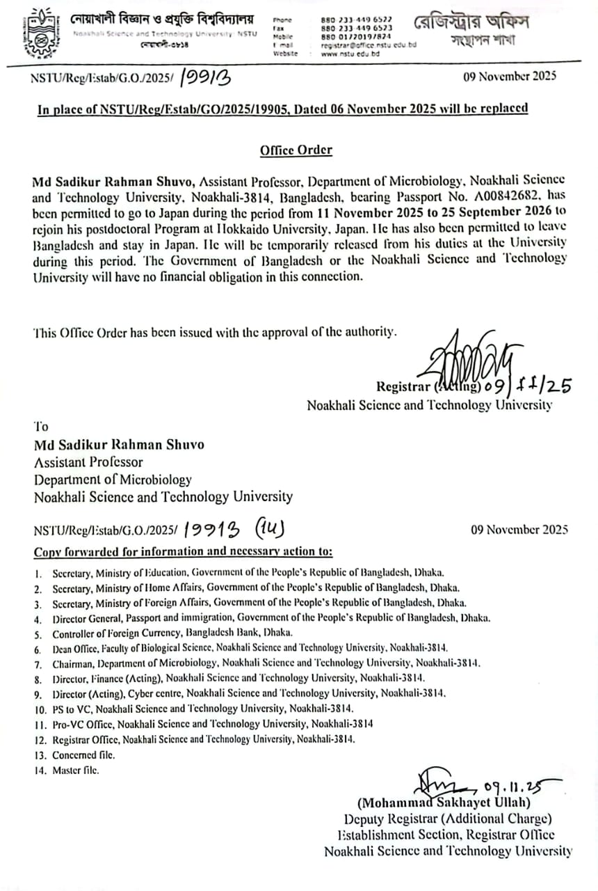 | Humayra Mahmud | Assistant Professor | Dept. of Zoology, NSTU | 14/07/2025 |