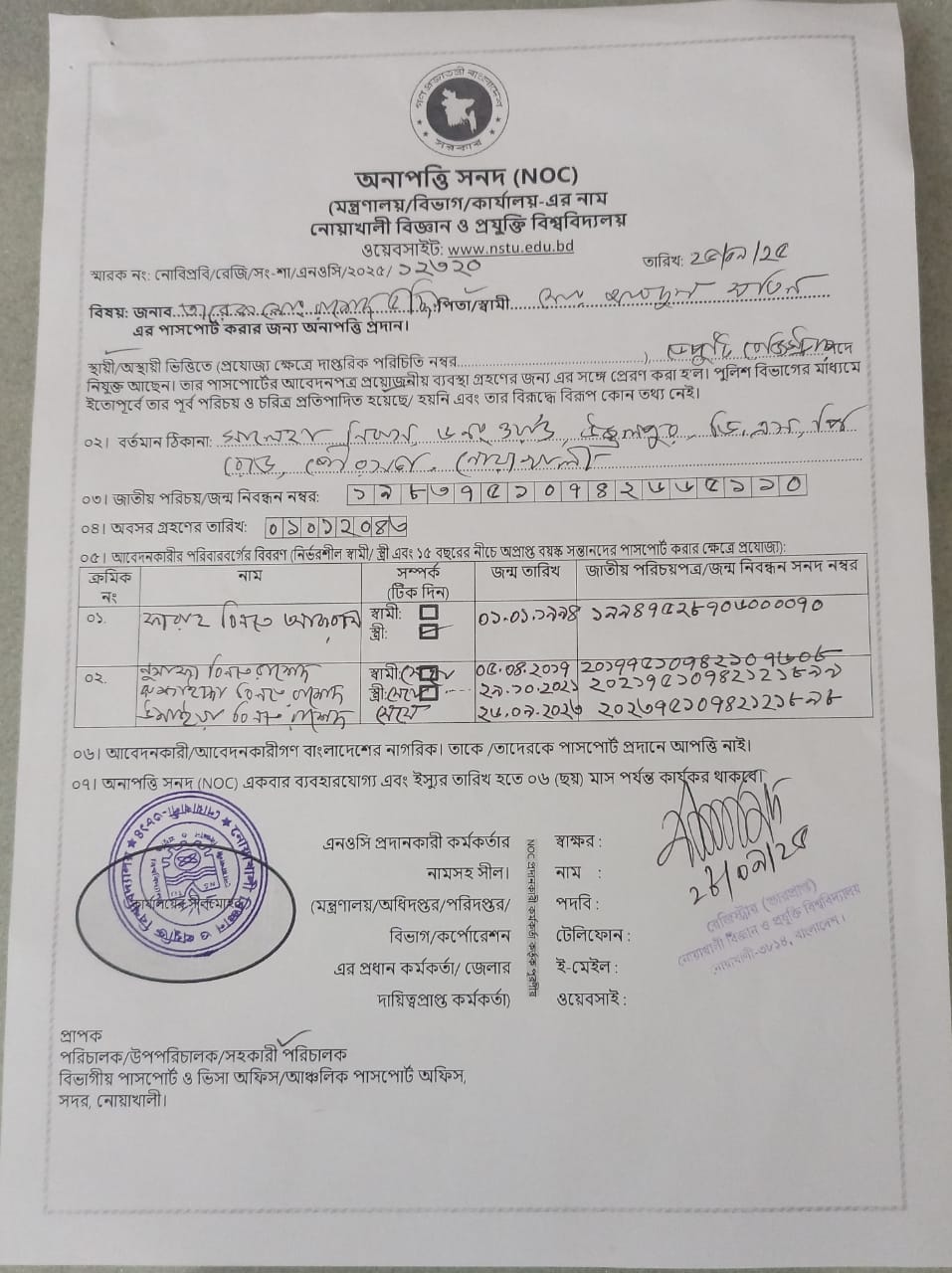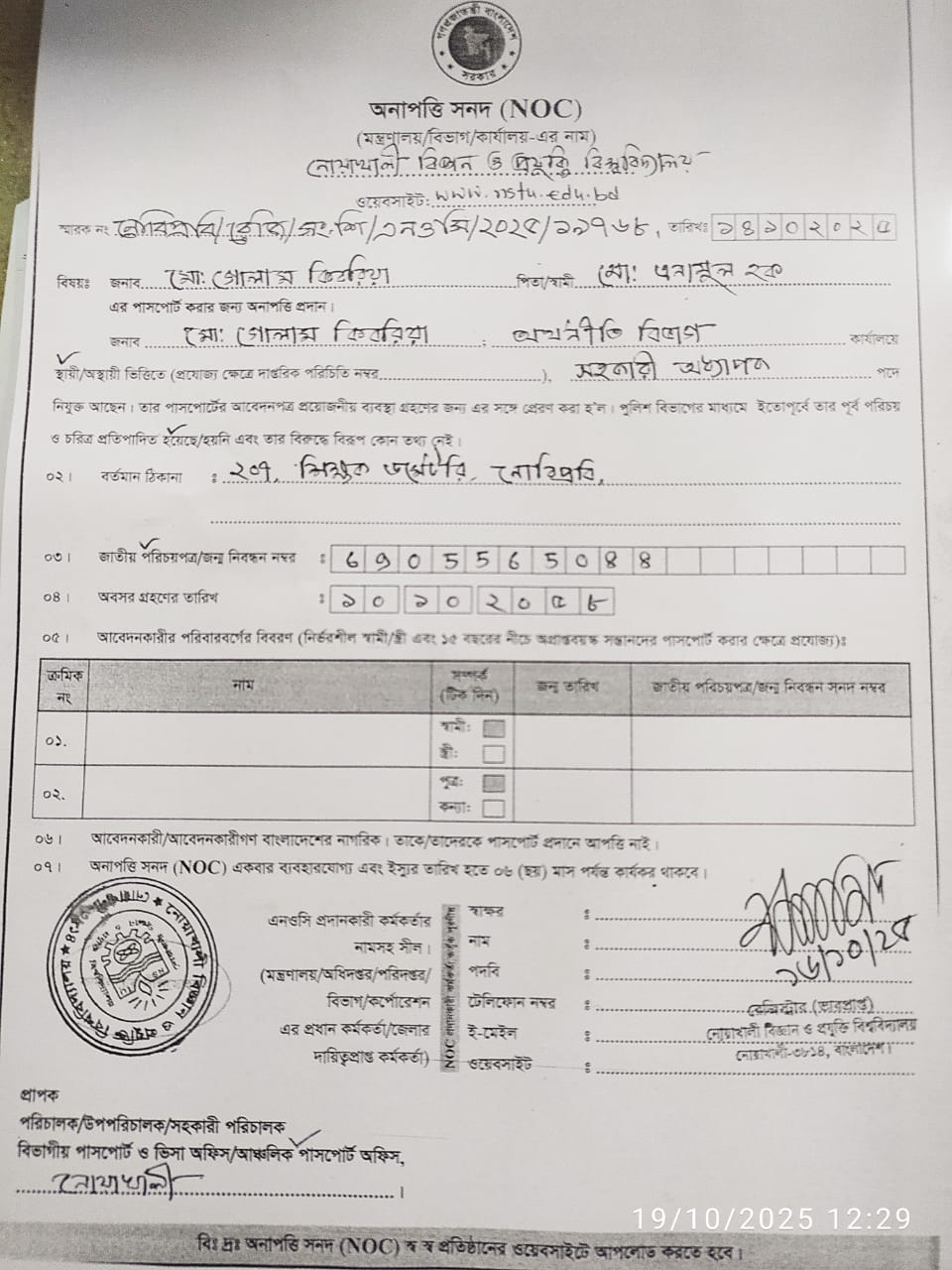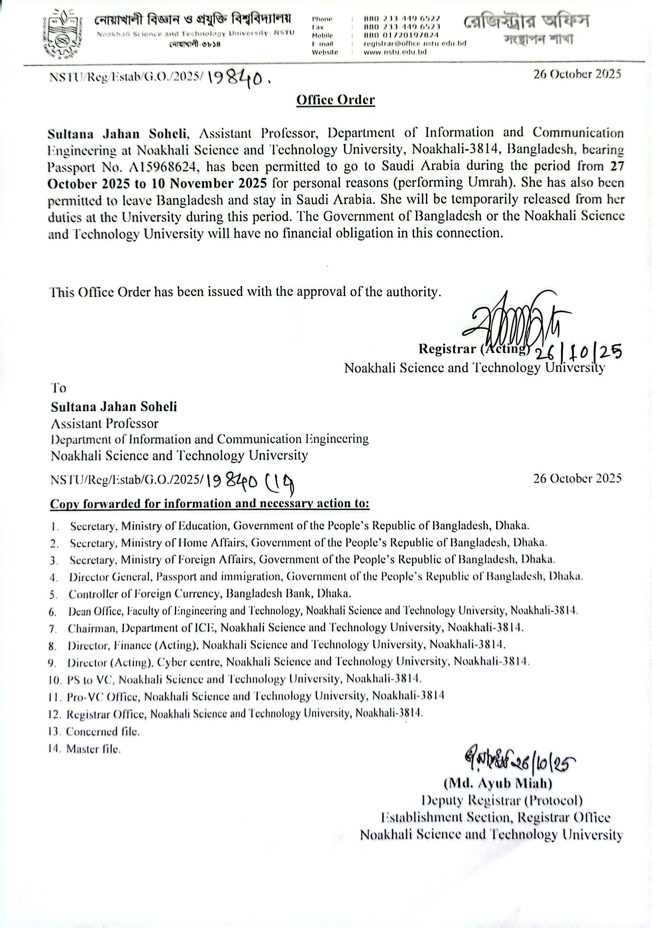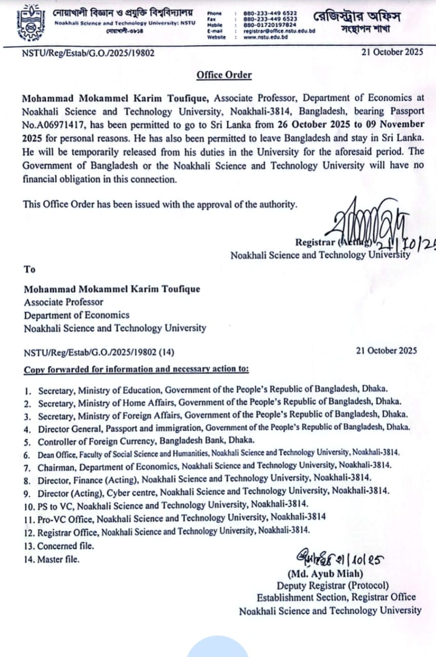 | Md. Masudur Rahman | Deputy Registrar | Dispatch Section, Registrar Office,NSTU | 22/09/2025 |