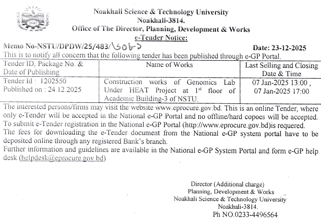 | e-Tender Notice: (1) Supplying, Installation, Testing and Commissioning of Lab Equipment for BGE Dept. of NSTU. (2) Supplying, Installation, Testing and Commissioning of Lab Equipment for ACCE Dept. of NSTU. (3) Supplying, Installation, Testing and Commissioning of Lab Equipment for Pharmacy Dept. of NSTU. |